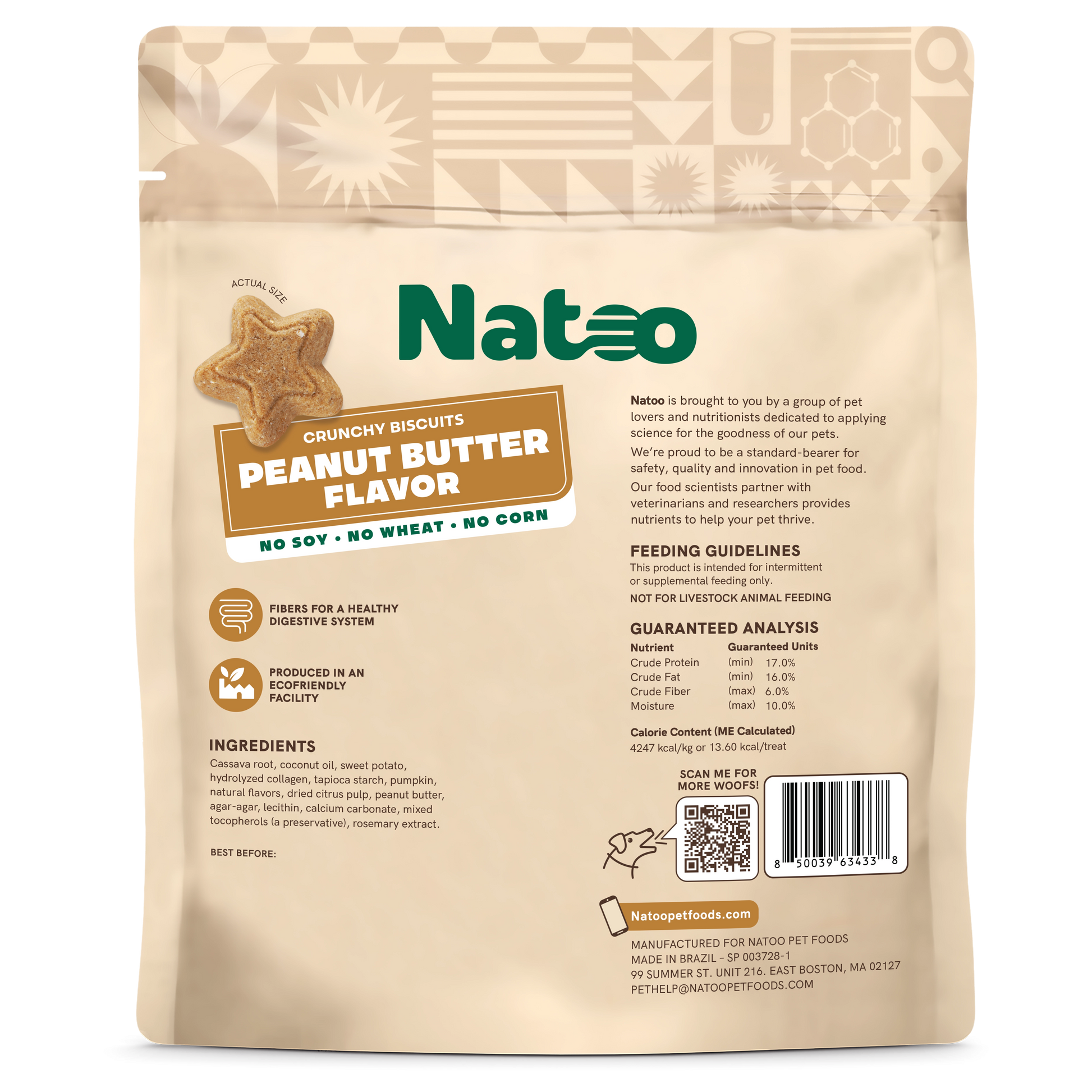 Natoo Crunchy Biscuits Peanut Butter Flavor is a biscuit that combines quality, health and flavor. Indicated for dogs, it offers important nutrients that help in intestinal health, immunity, skin and coat and oral health of dogs