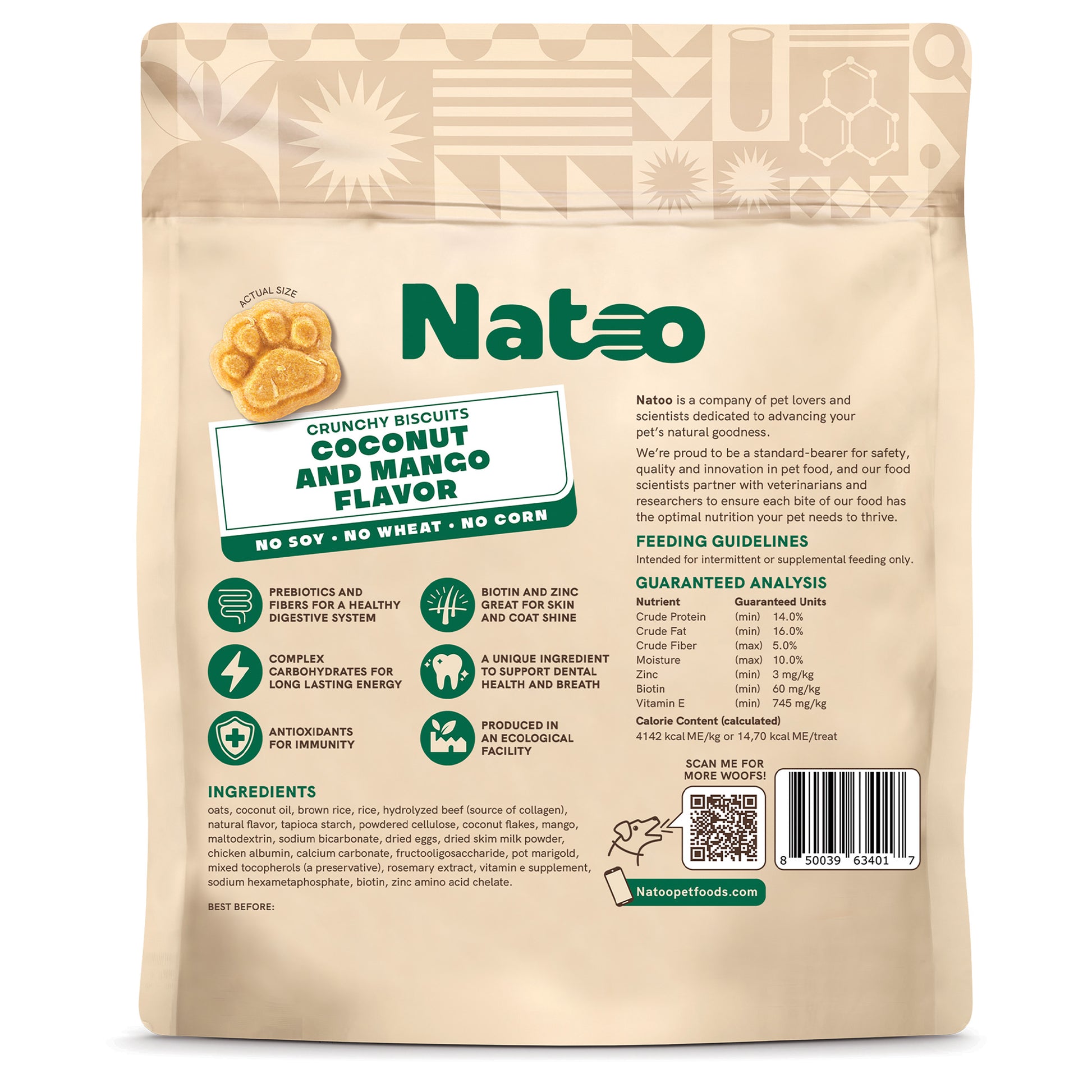 Natoo Crunchy Biscuits Coconut And Mango Flavor is a biscuit that combines quality, health and flavor. Created for small dogs, it offers important nutrients that help in intestinal health, immunity, skin and coat and oral health of dogs.